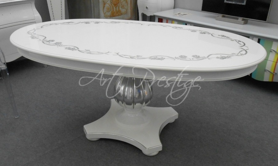 Important White lacquered oval table with teardrop base and decorations in silver leaf, solid beech