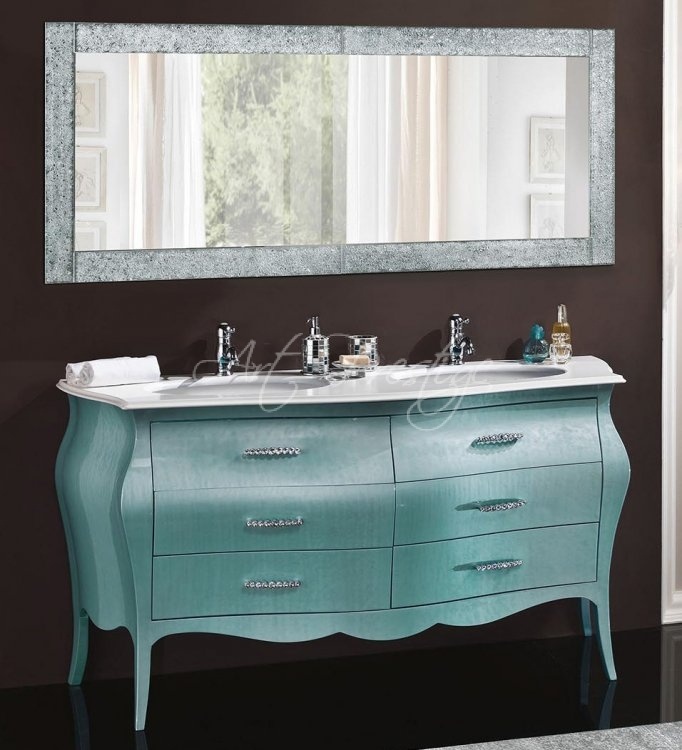 Baroque rounded bathroom cabinet with two sinks and piano in mineral marble, six drawers, Swarovsky handles. Solid beech wood.