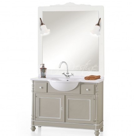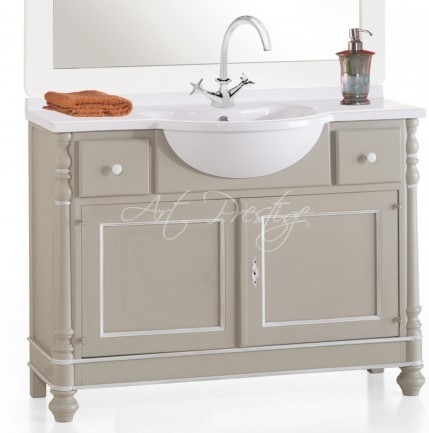 Elegant and refined classic bathroom cabinet with two drawers and two doors, turned feet and shoulders, solid beech blockboard,