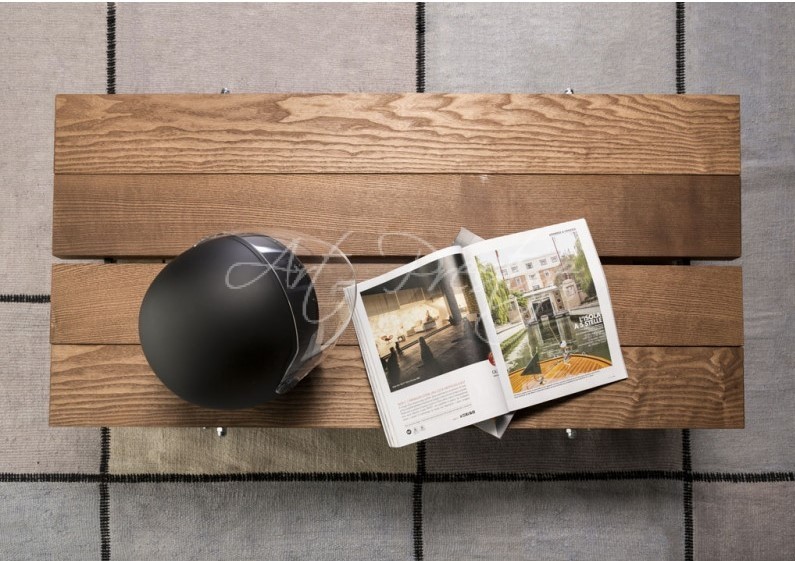 Coffee table with top and base in very thick wood and legs in tempered glass.