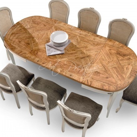 Classic oval table with inlaid top in olive briar, extendable, complete with two internal extensions measuring 44 cm each, when not in use the extensions are stored under the top, engraved legs and band under the top. Wood: Solid beech.