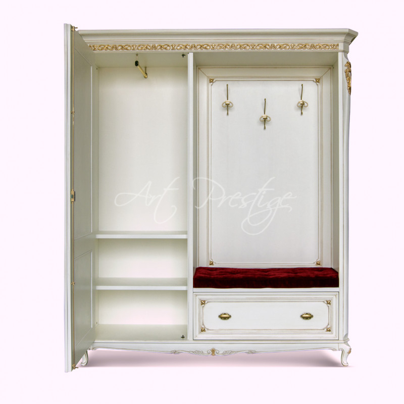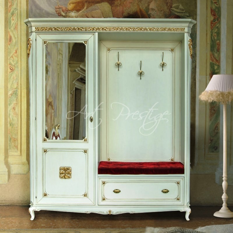 Importante armadio da ingresso con un’anta a vetro nella parte superiore un cassetto sottostante il vano appendiabiti aperto, fascia sotto cappello con importanti fregi intagliati.