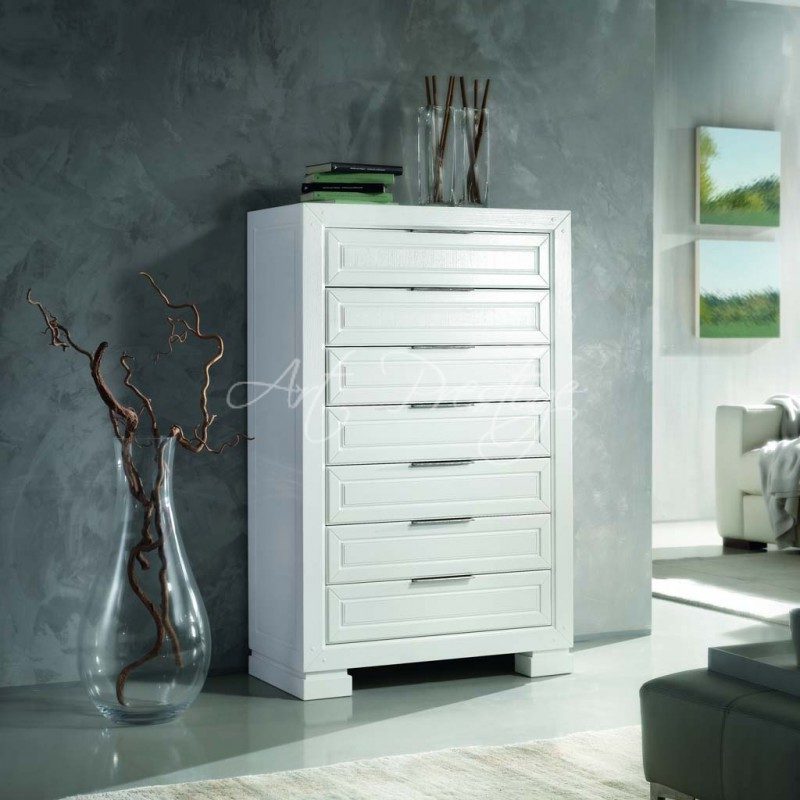 Cassettiera con sette cassetti molto particolari gli angoli che presentano dei piccoli tasselli che simulano i chiodi in legno che venivano utilizzati un tempo per assemblare i mobili.