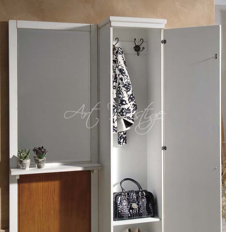 Ingresso con specchio liscio a mezzo busto, una comodo mensolina, sulla destra un armadietto ad un anta battente con all’interno comodi ripiani, in faggio-massello, color bianco.